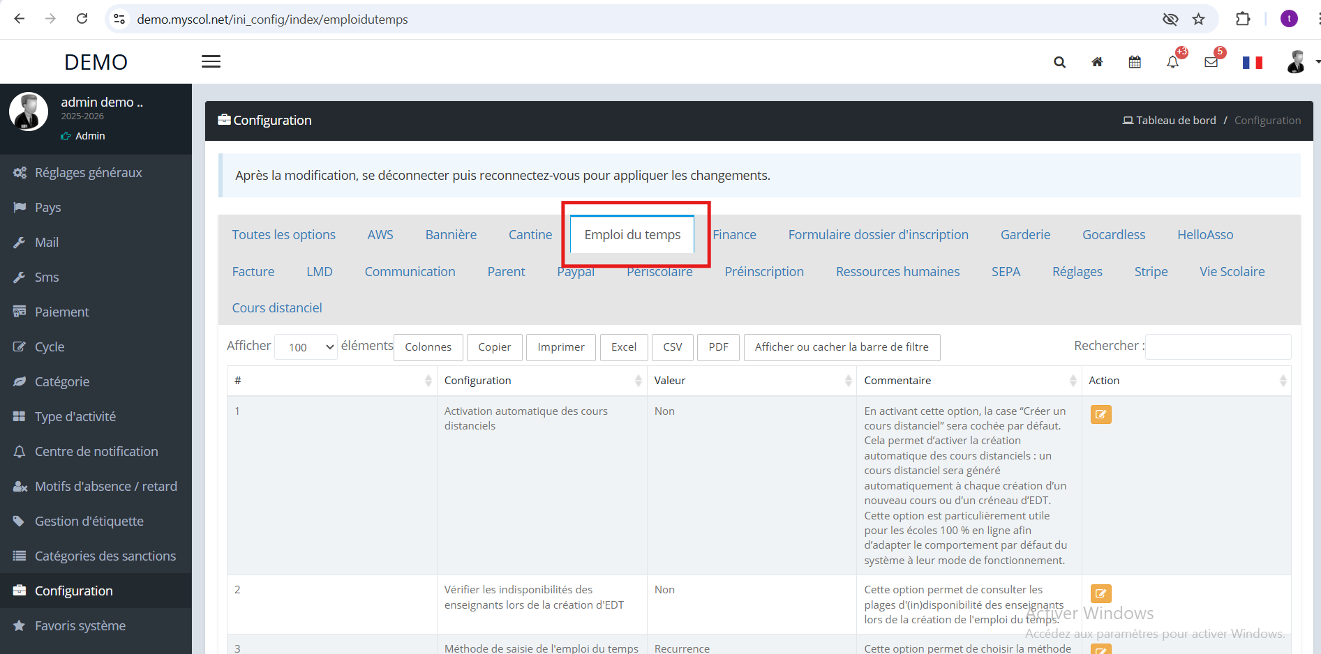 4️⃣ Recherchez l’option Activation automatique des cours distanciels
