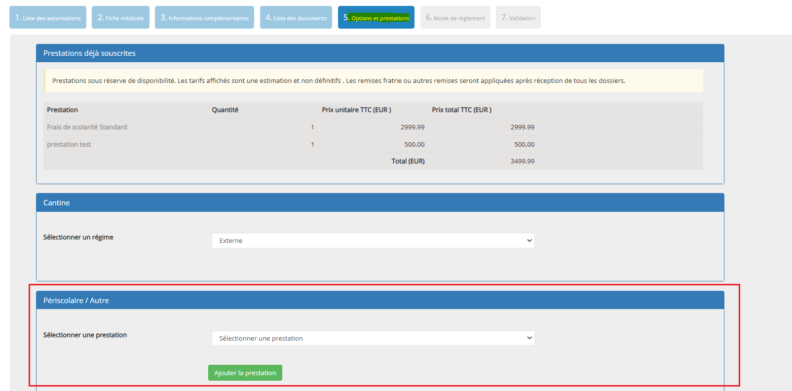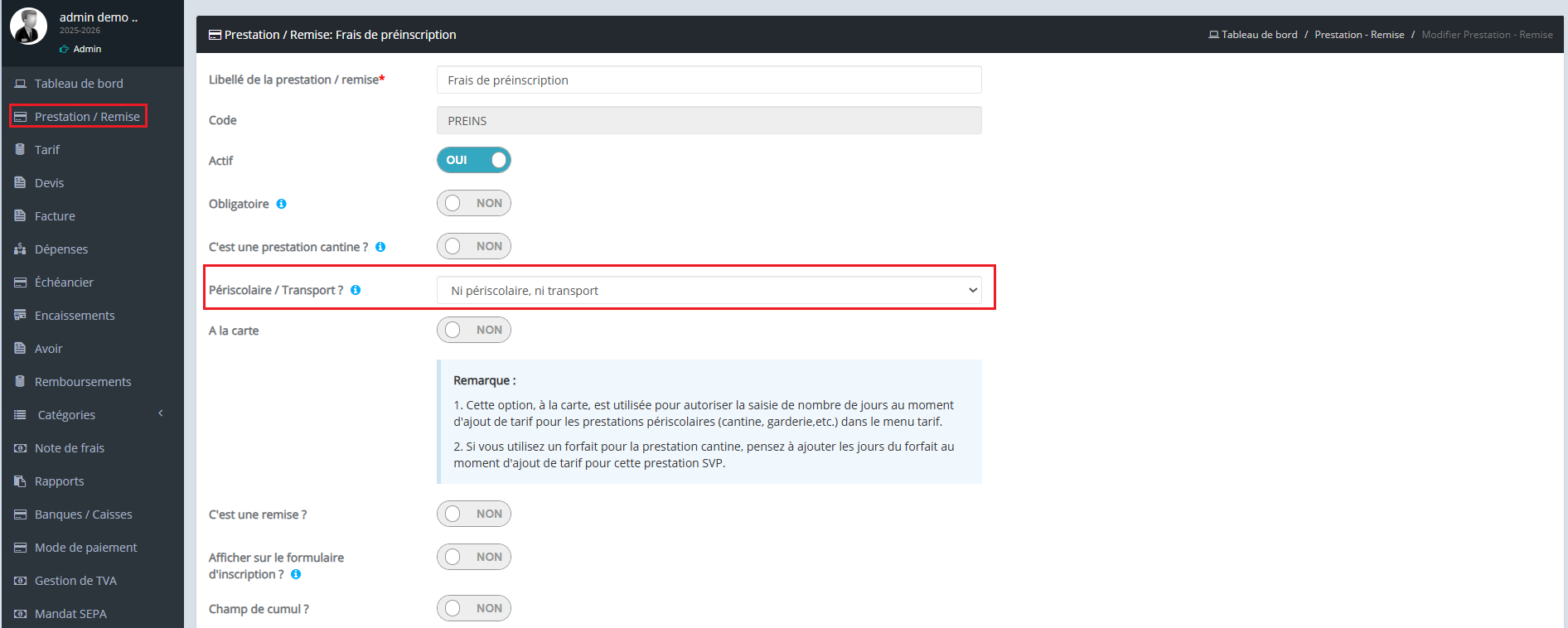 « Désactiver la périscolaire/transport dans le formulaire d’inscription et dans l’interface d’ajout de prestation ou de remise ».