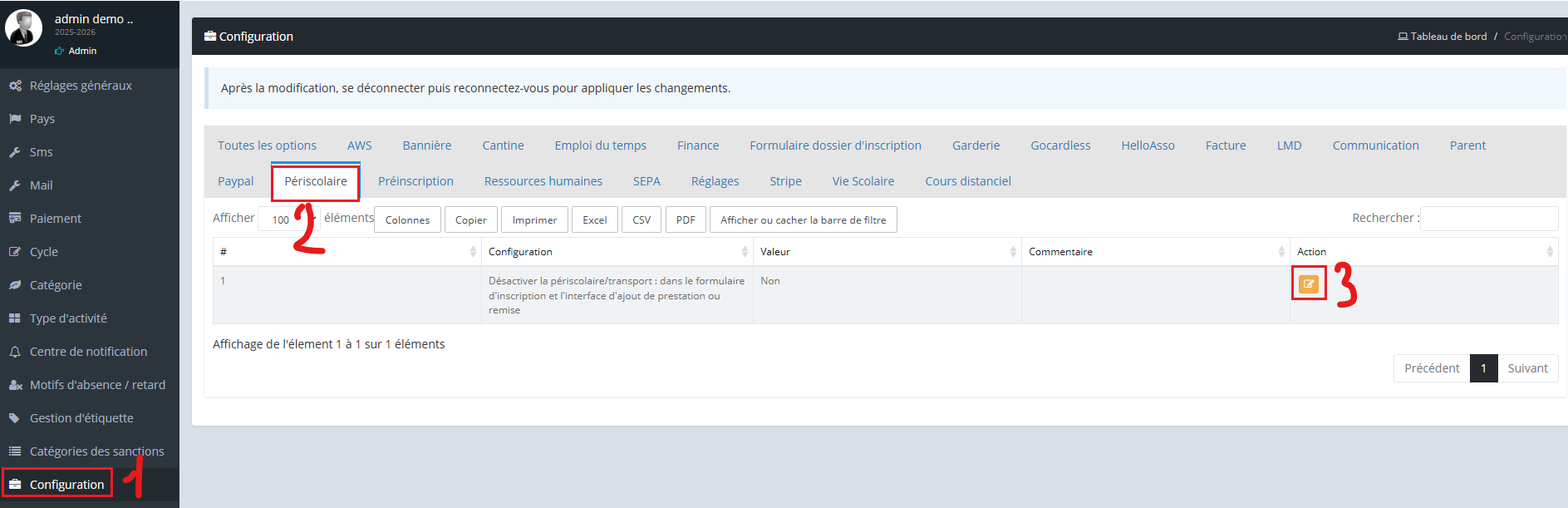 3. Accédez à l’onglet « Périscolaire », puis cliquez sur le bouton « Modifier » de l’option :