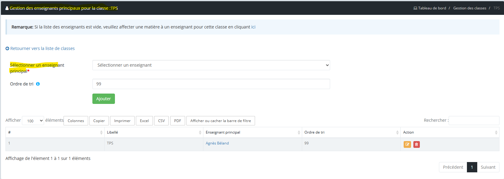 Puis cliquez sur l'icône "Ajouter un enseignant principal", sélectionnez l’enseignant puis validez en cliquant sur le bouton "Ajouter" .