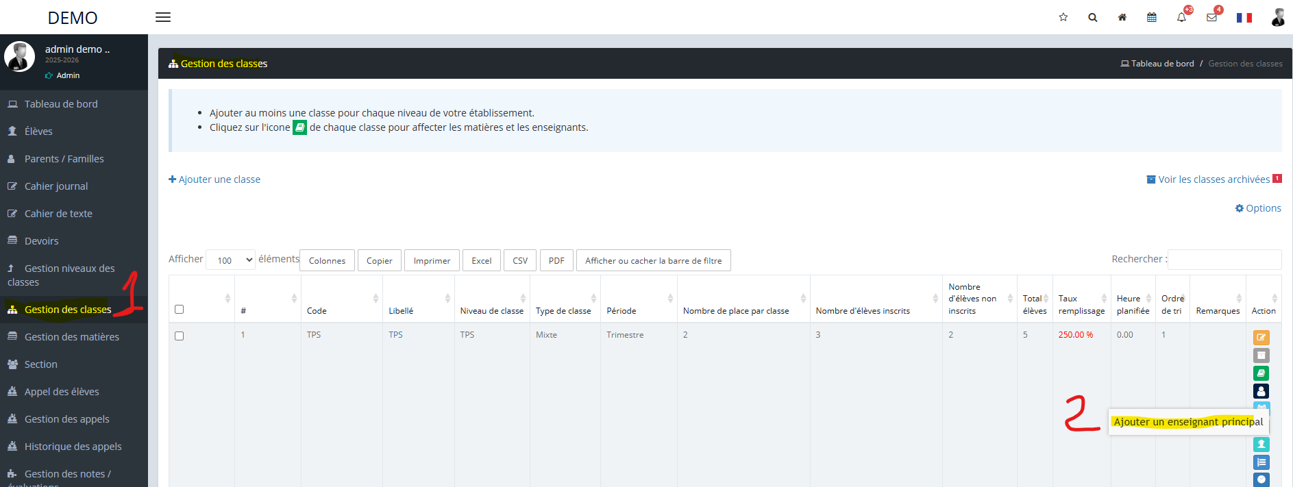 Pour affecter une section à un élève, il faut d'abord affecter des sections à des classes. Pour le faire, veuillez suivre les instructions ci-dessous. Allez dans module "Vie scolaire" 1. Allez dans le menu "Gestion des classes" 2. Cliquez sur l'icone ...