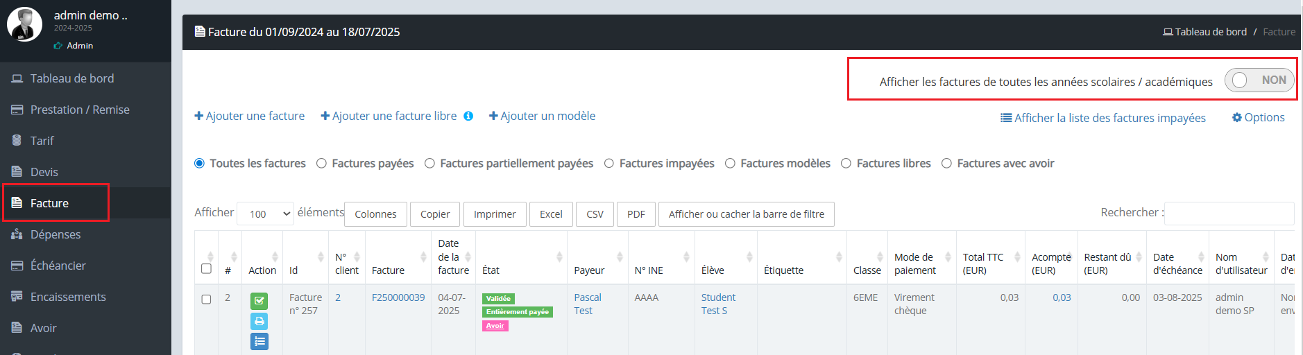 Par défaut, le système affiche uniquement les factures de l’année scolaire / académique en cours.