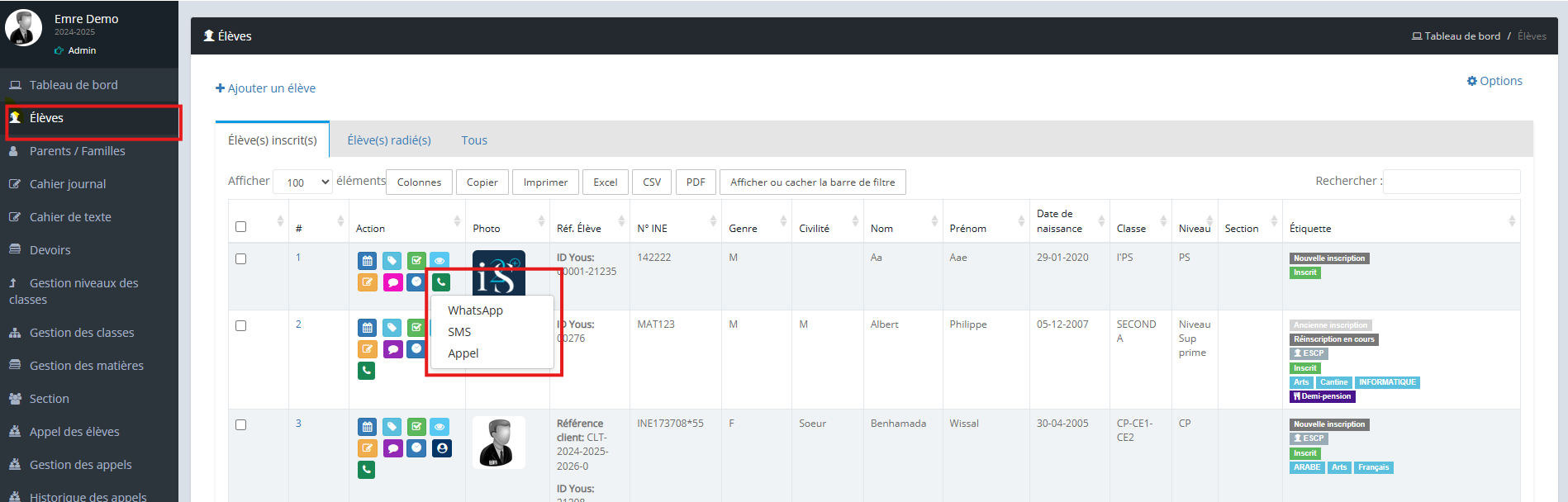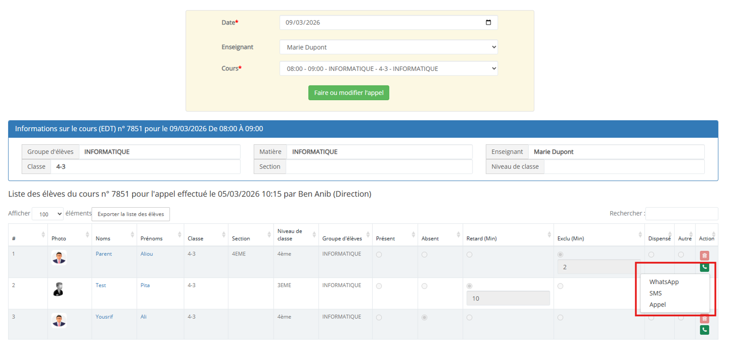 Comment contacter un élève ou un parent (appel, SMS, WhatsApp) ?