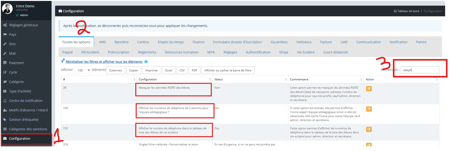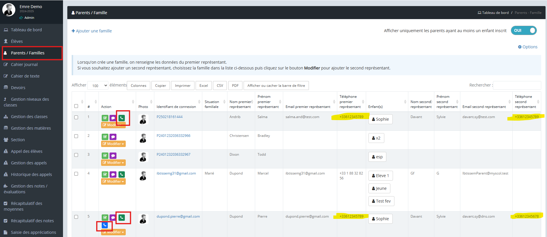 seuls les profils Admin, Direction et Secrétaire peuvent voir les icônes et les numéros des élèves. - Si l’option d’activation des numéros des deux représentants est activée :