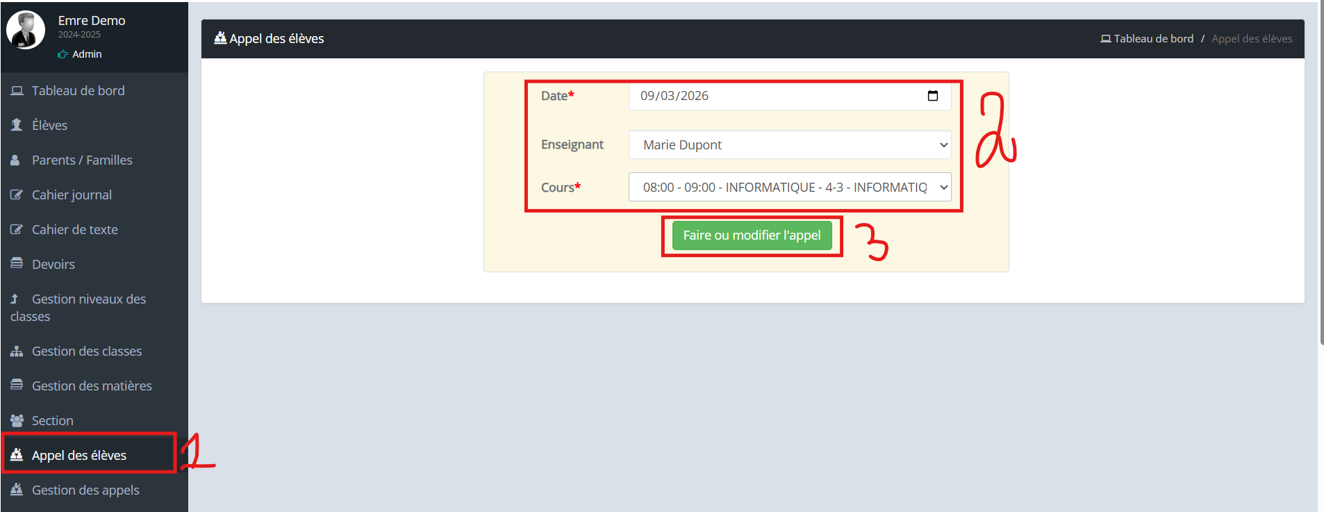 Pour modifier ou supprimer un appel des élèves, veuillez suivre les instructions ci-dessous. Allez dans vie scolaire Méthode 1 : Accéder à appel depuis tableau de bord Choisissez le menu Tableau de bord=> cliquez sur Voir l'appel( appel déjà ...