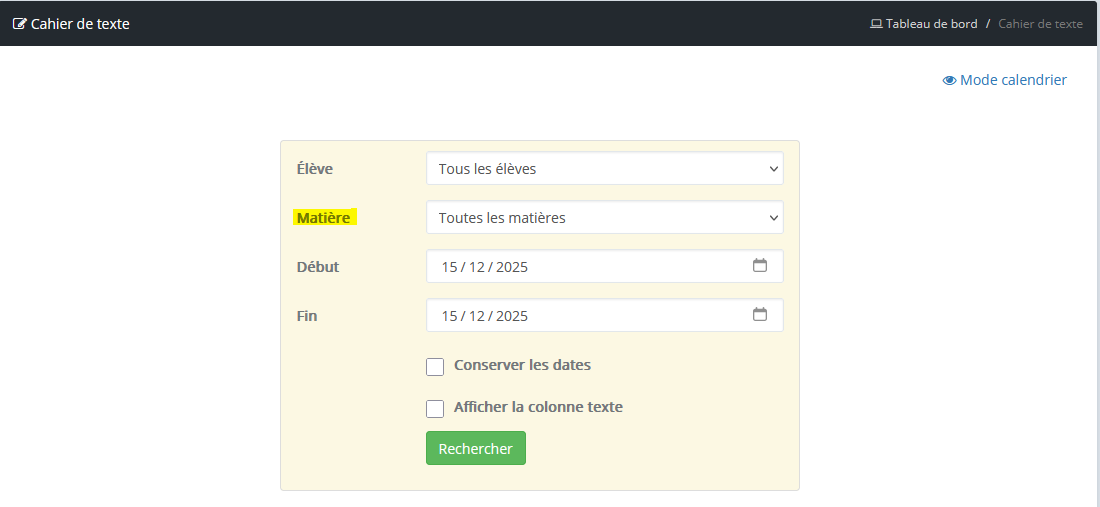 🔍 Dans la vue Tableau, un filtre par matières est ajouté :