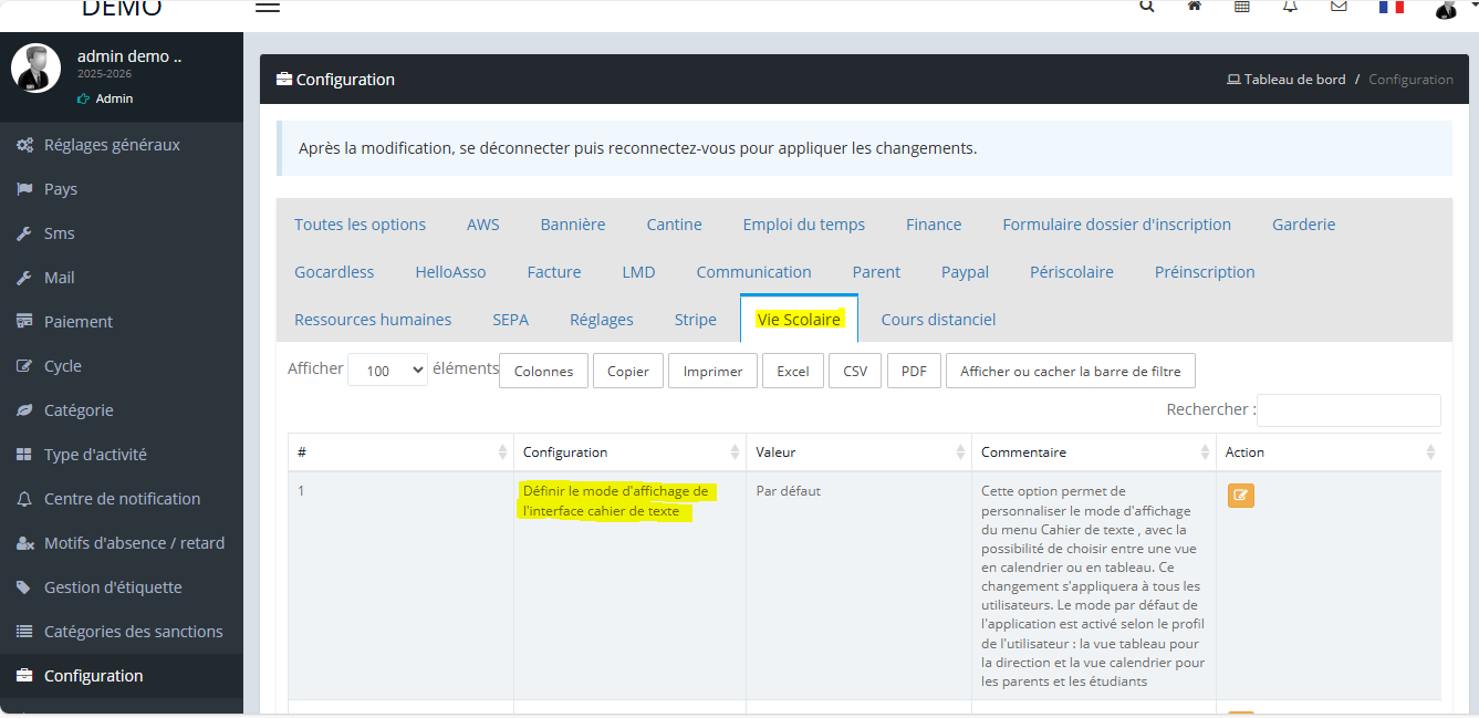 Cette option permet de personnaliser le mode d’affichage du menu Cahier de texte en choisissant entre une vue Calendrier 📅 ou une vue Tableau 📊.