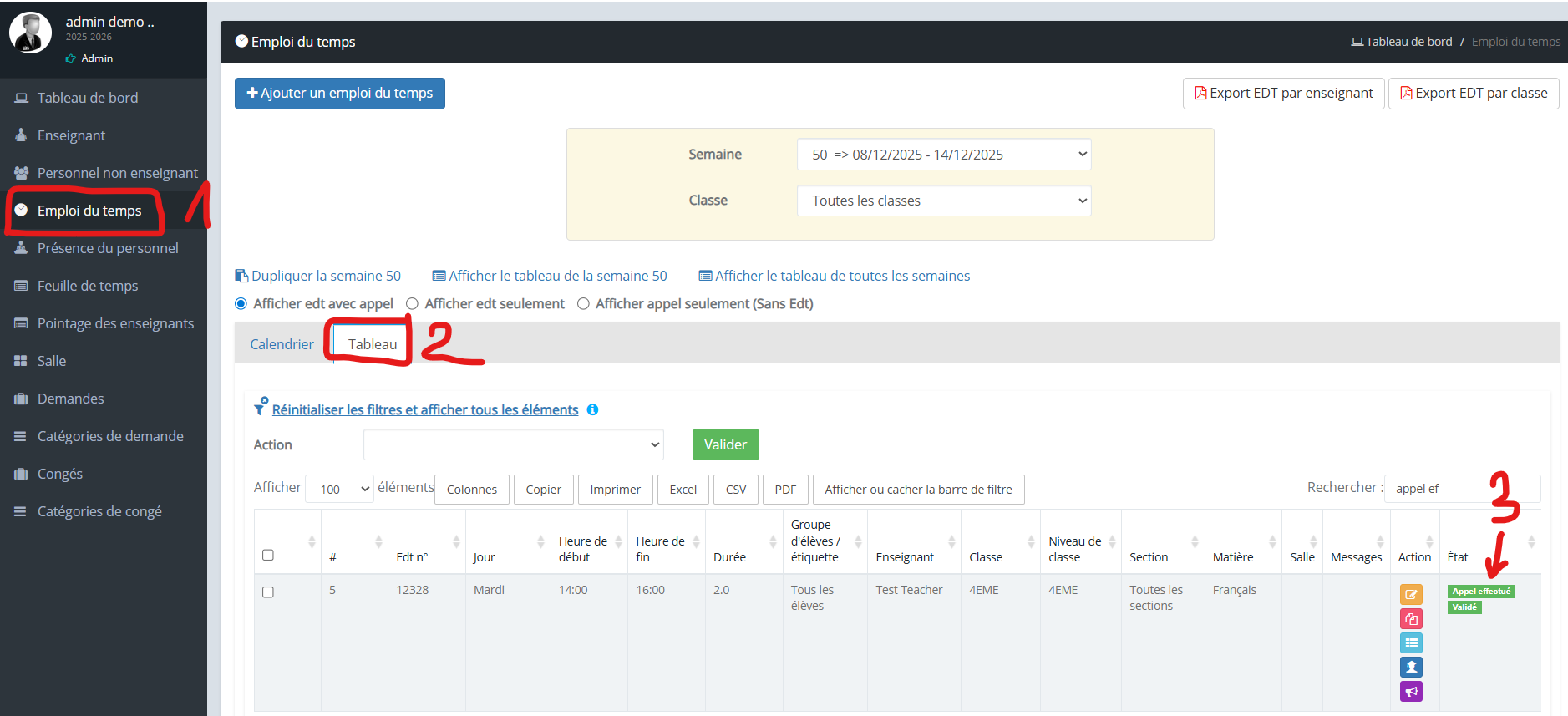 Accédez ensuite au menu « Emploi du temps », sélectionnez l’onglet Tableau, puis cliquez sur le libellé « Appel effectué » de l’emploi du temps que vous souhaitez supprimer.