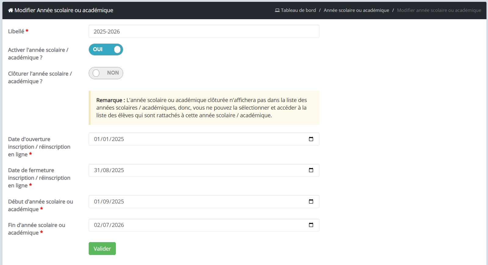 État : permet d’activer ou désactiver l'année scolaire. Une rentrée désactivée ne sera pas visible dans la liste des années.