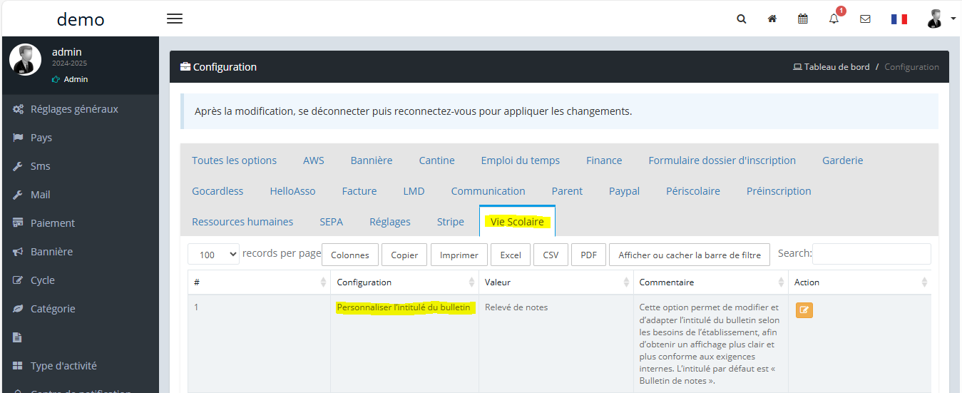 Cette option permet de personnaliser l’intitulé du bulletin selon les besoins de l’établissement , afin d’obtenir un affichage plus clair, plus compréhensible et conforme aux exigences internes.