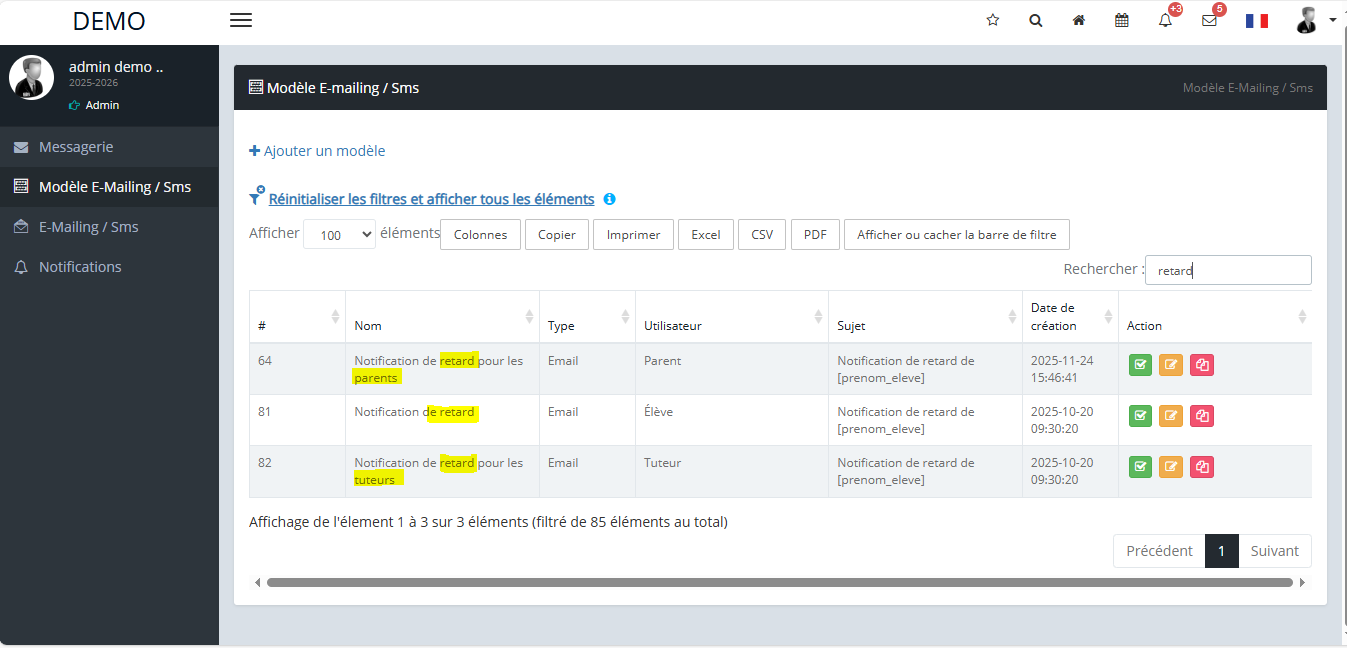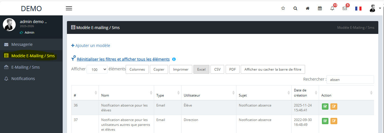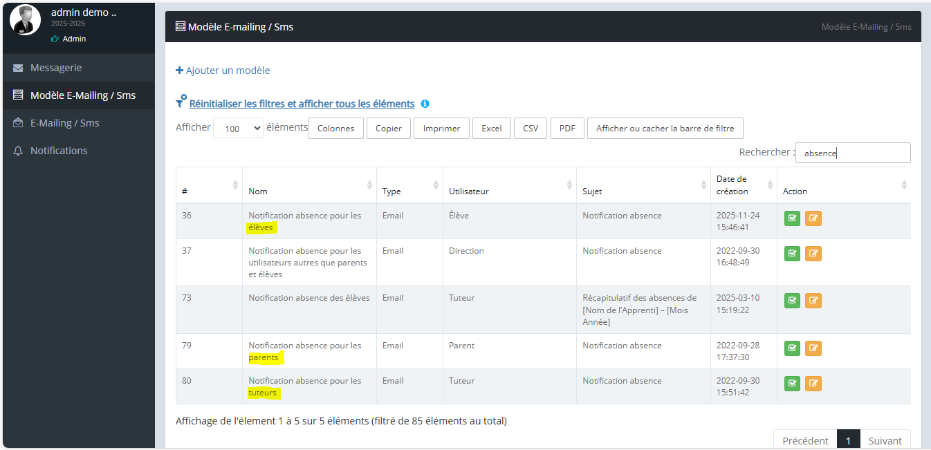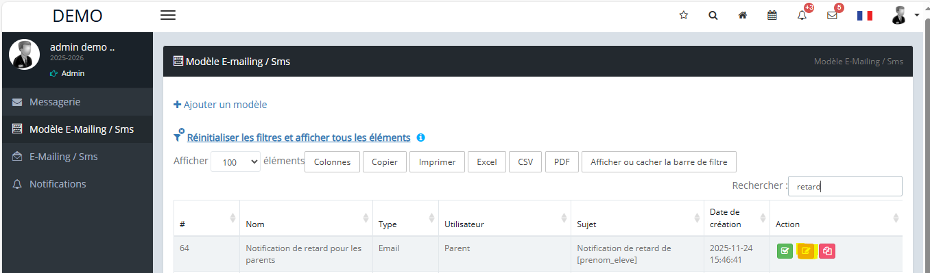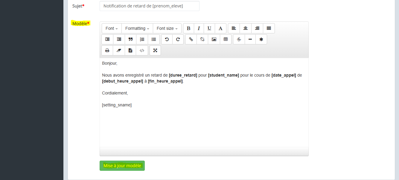 Repérez le modèle que vous souhaitez personnaliser (absence ou retard).