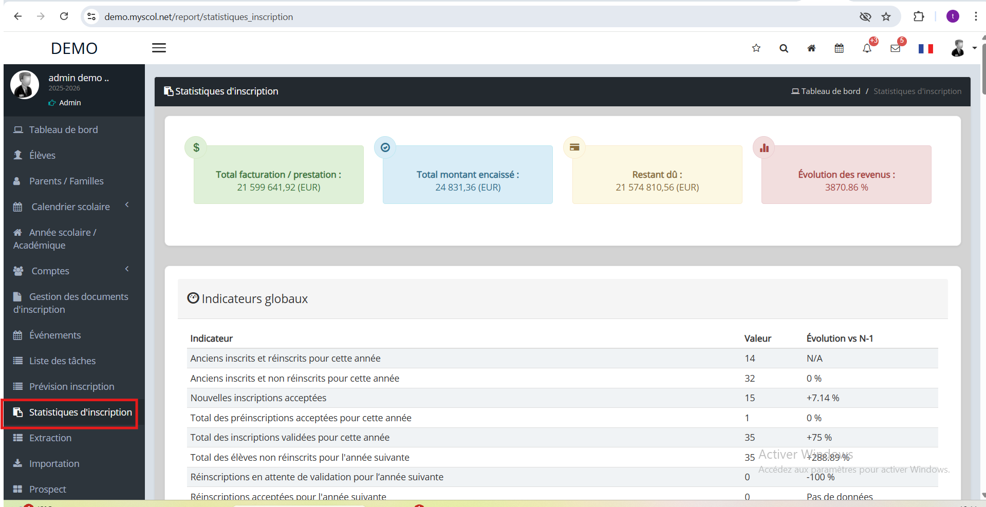 Cette vue d’ensemble permet de suivre l’évolution des inscriptions, d’identifier les tendances générales et d’optimiser la gestion des capacités des classes et des ressources de l’établissement.