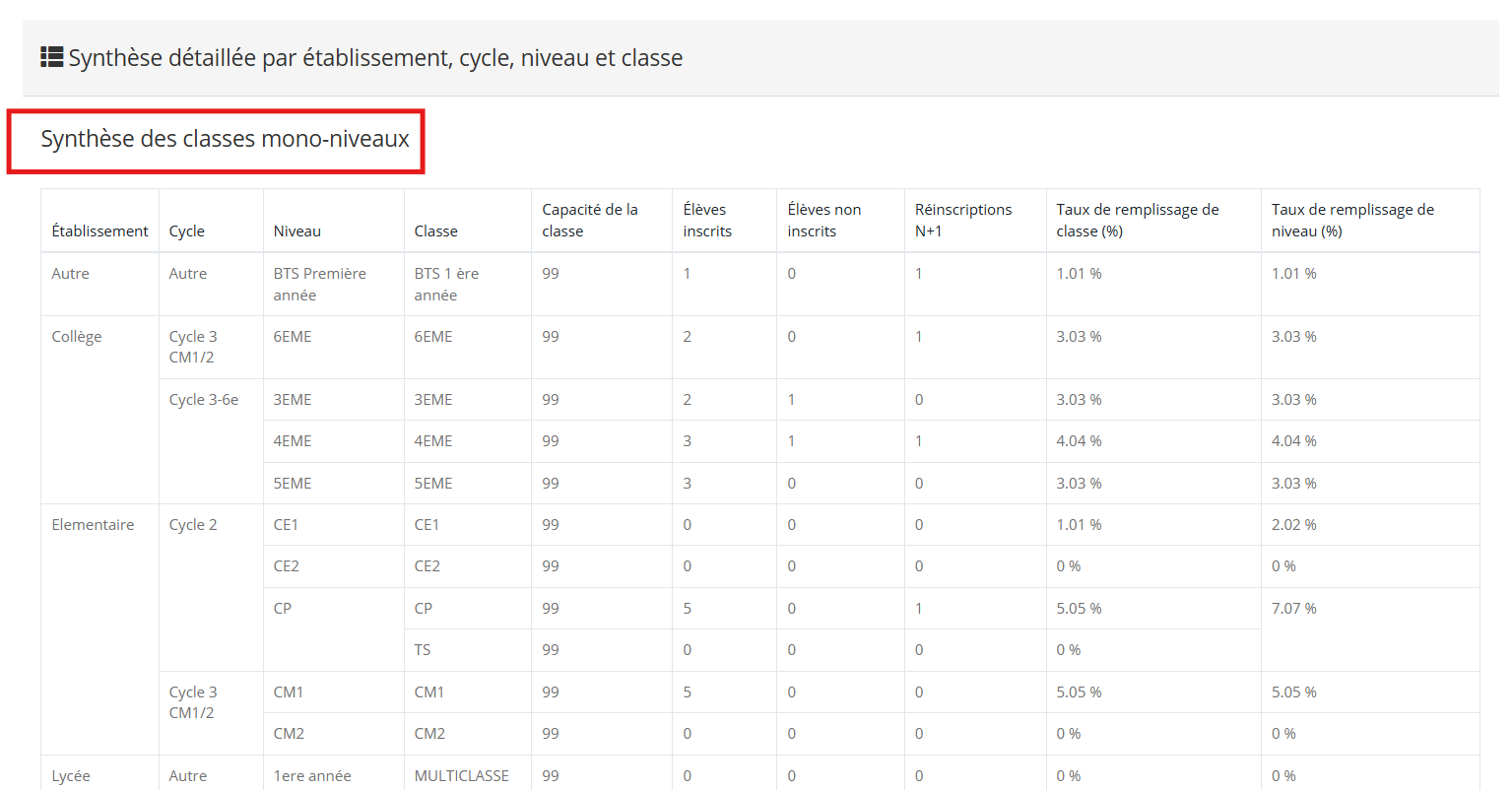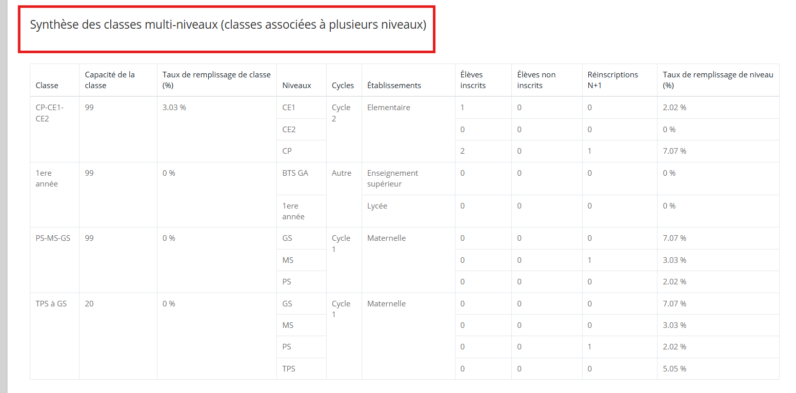 - Classes multi-niveaux : la deuxième vue regroupe les classes comportant plusieurs niveaux, en consolidant les mêmes indicateurs pour chaque niveau associé.