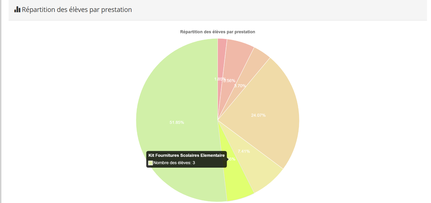 Cette section montre la répartition des élèves selon les prestations proposées par l’établissement. Les graphiques mettent en évidence le nombre d’élèves concernés par chaque prestation, permettant d’identifier rapidement les services les plus utilisés et d’optimiser leur organisation.