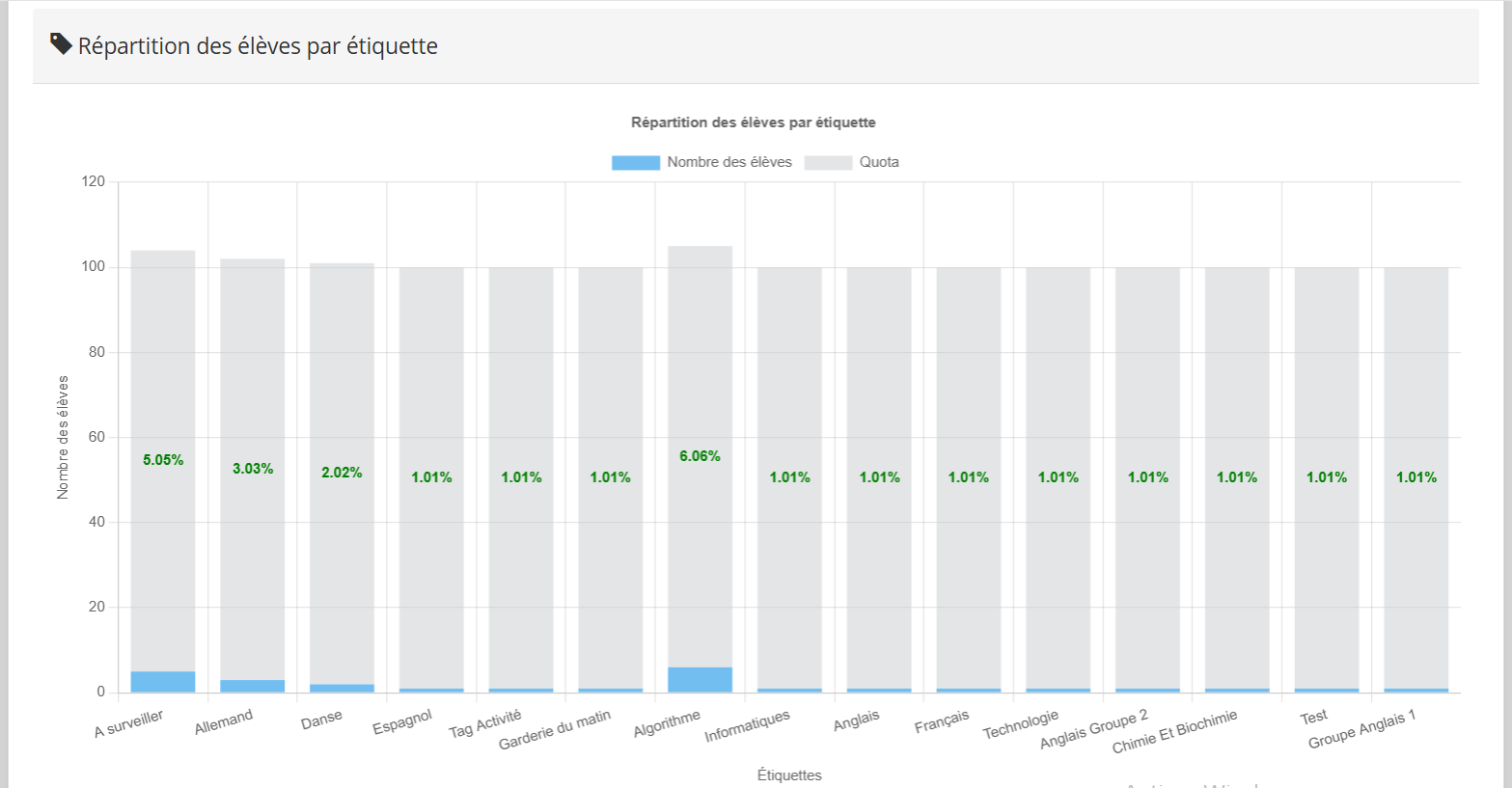 Cette section présente la répartition des élèves selon les étiquettes attribuées. Les graphiques affichent le nombre d’élèves par étiquette ainsi que leur proportion par rapport aux quotas, offrant une vision claire de la diversité des inscriptions.