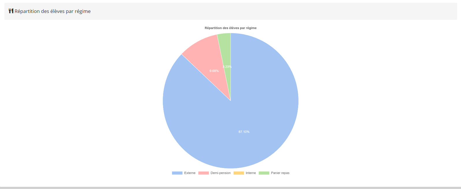 Cette section illustre la répartition des élèves selon leur régime de restauration. Les graphiques circulaires permettent de visualiser rapidement le nombre d’élèves externes, demi-pensionnaires, internes ou bénéficiant d’un panier repas, facilitant la gestion des services de restauration.