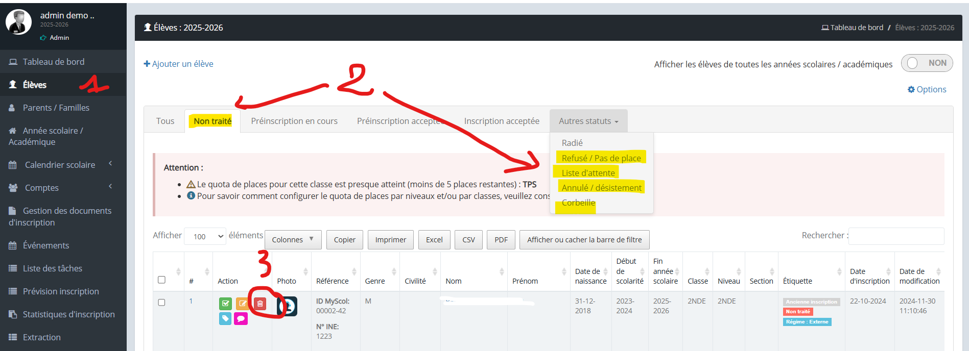Seuls les élèves ayant l’un des statuts suivants peuvent être supprimés :