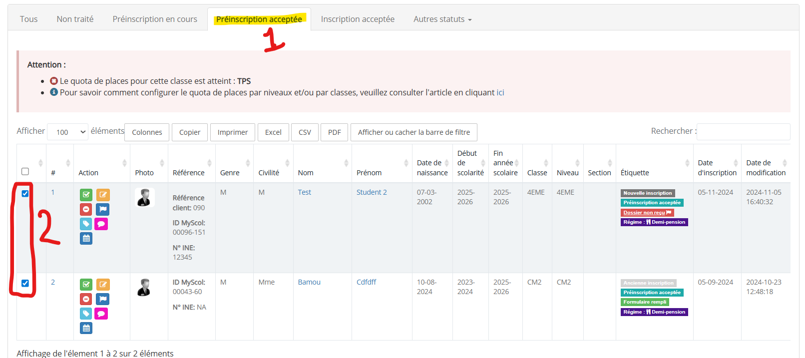 2. Sélectionnez les élèves dont vous souhaitez valider l’inscription.