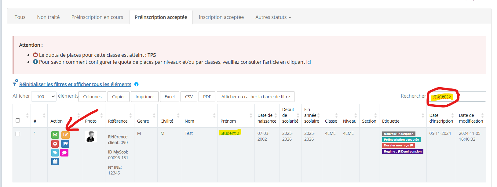 Pour pouvoir valider une inscription, le statut de l’élève doit être « Préinscription acceptée + Inscription acceptée ».