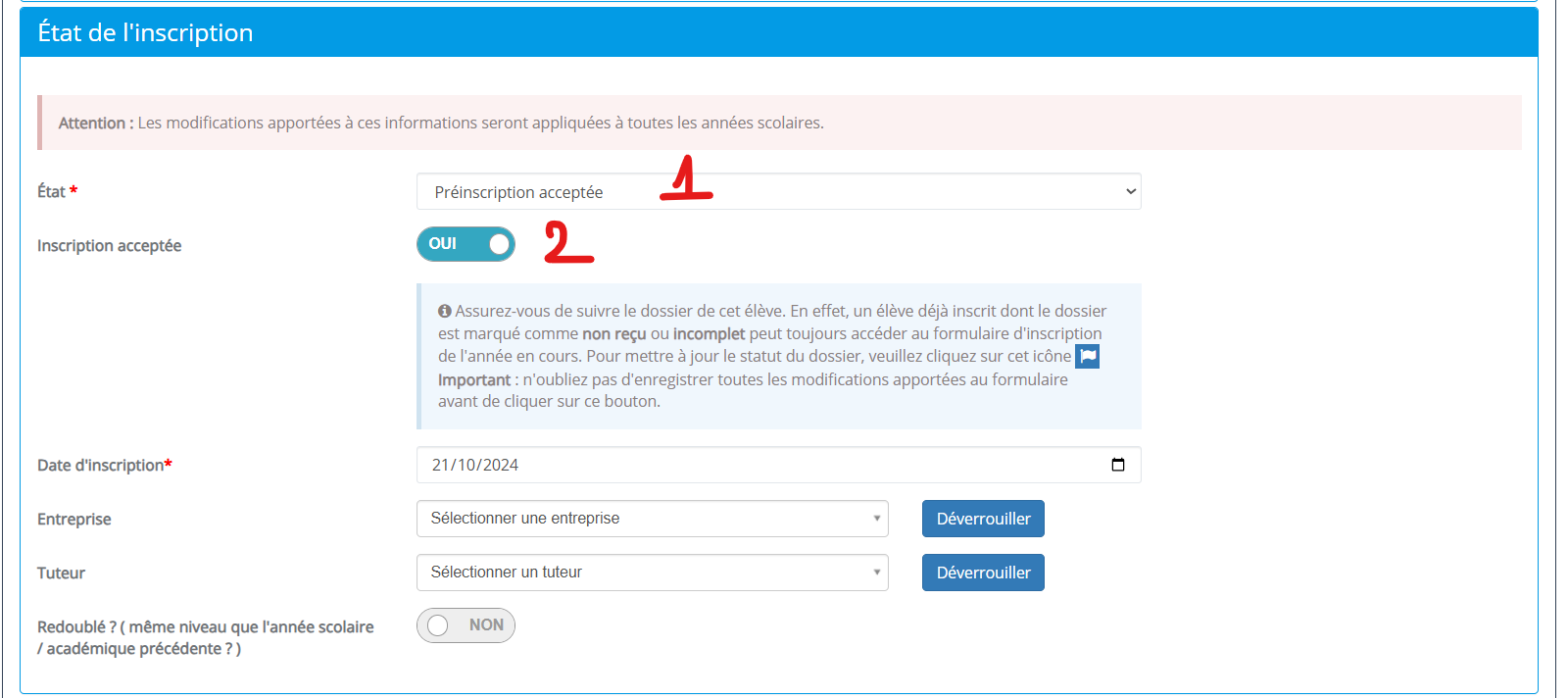 Sélectionnez "Préinscription acceptée" dans la liste d'état puis cochez OUI dans Inscription acceptée.