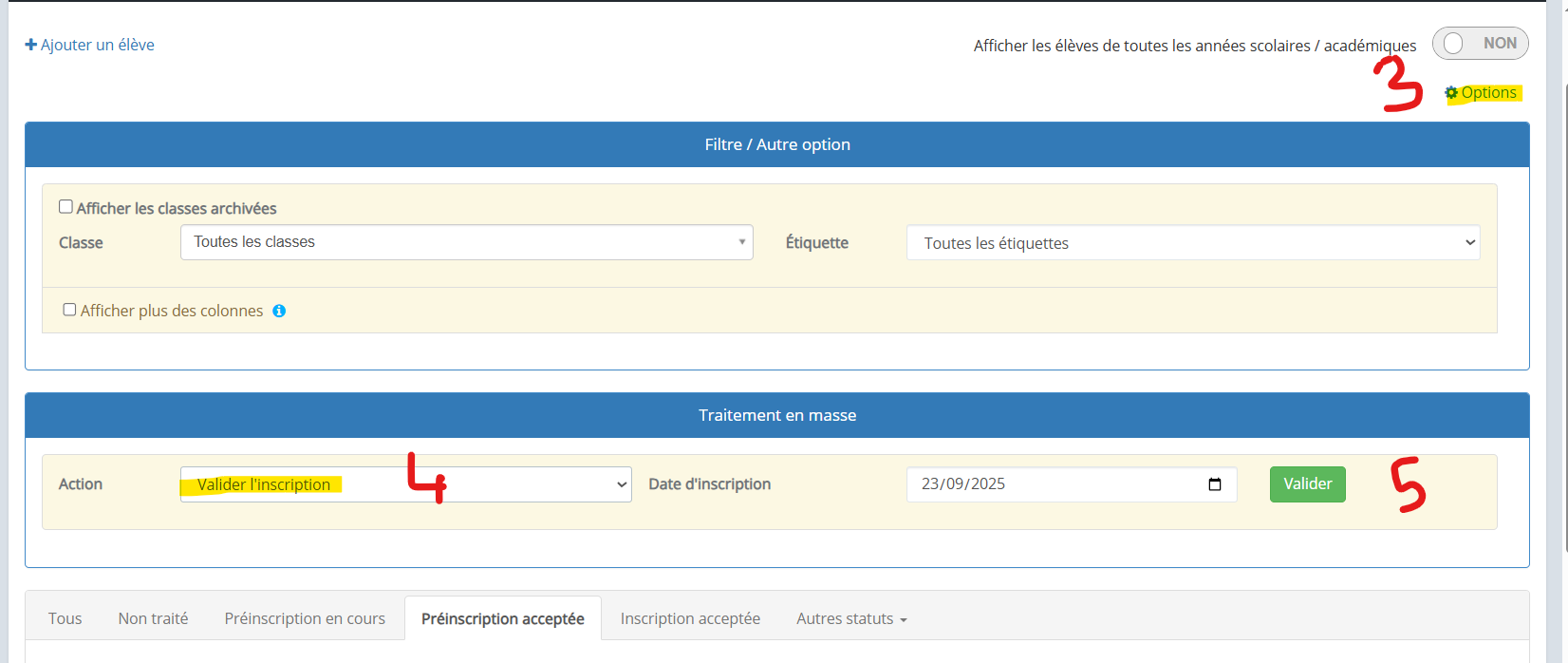 Action en masse : valider les inscriptions de plusieurs élèves